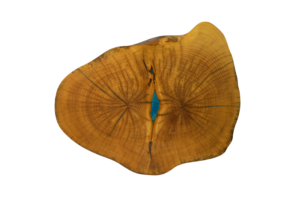 Live edge oak cross section with two trunks.