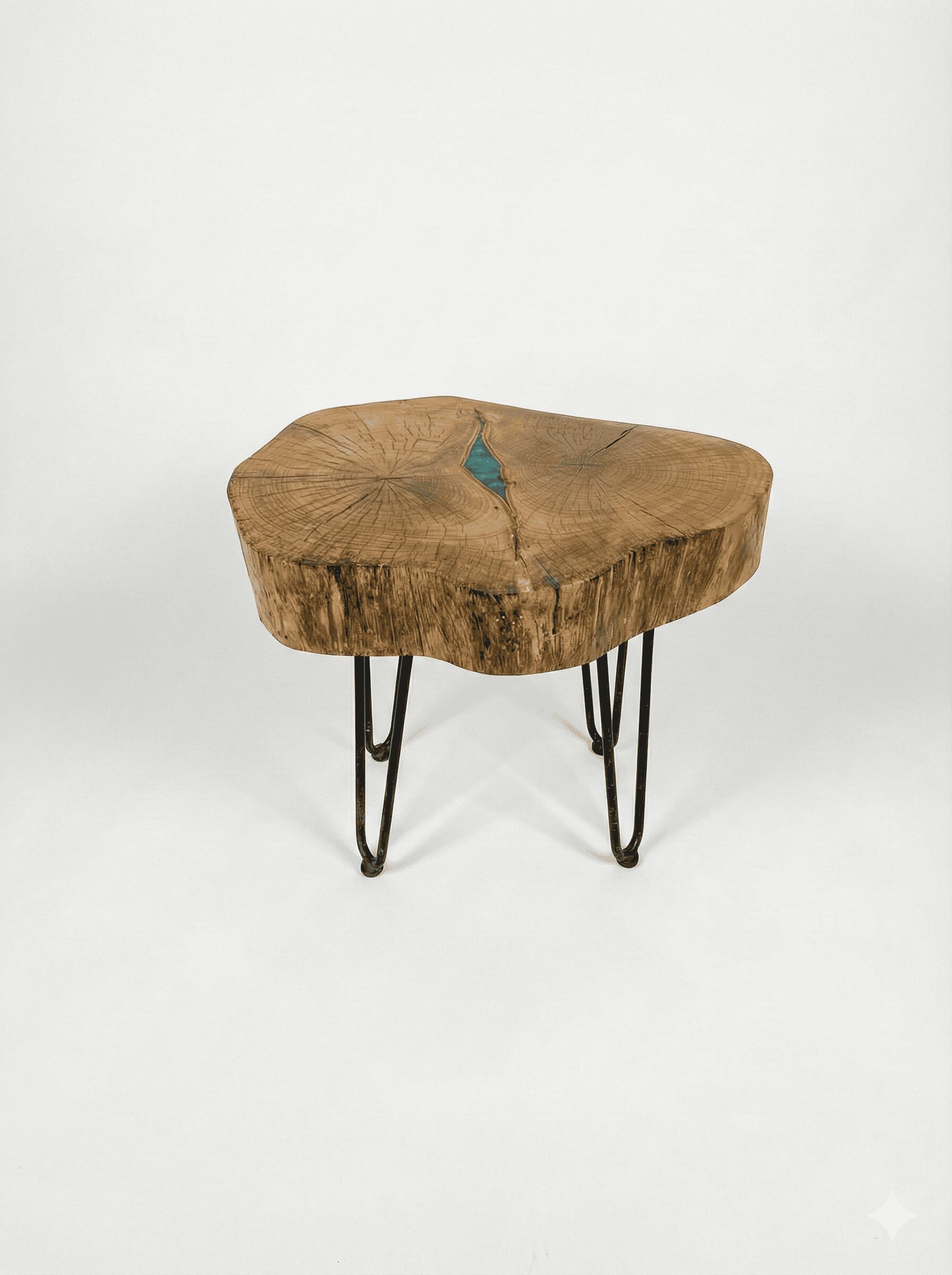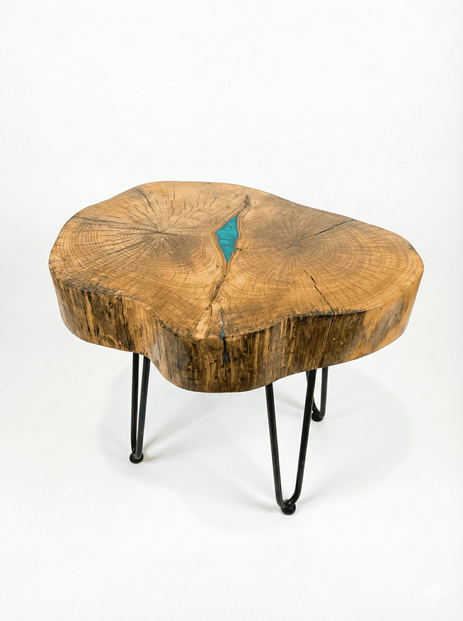This uniquely shaped thick live-edge cross-sectional table has a beautiful ring structure and natural light tan color. The cross section is where the tree split into two separate trunks. The cross-section can be used as a small accent table and was finished with tung oil and then with a satin polyurethane coat to provide a protective layer.