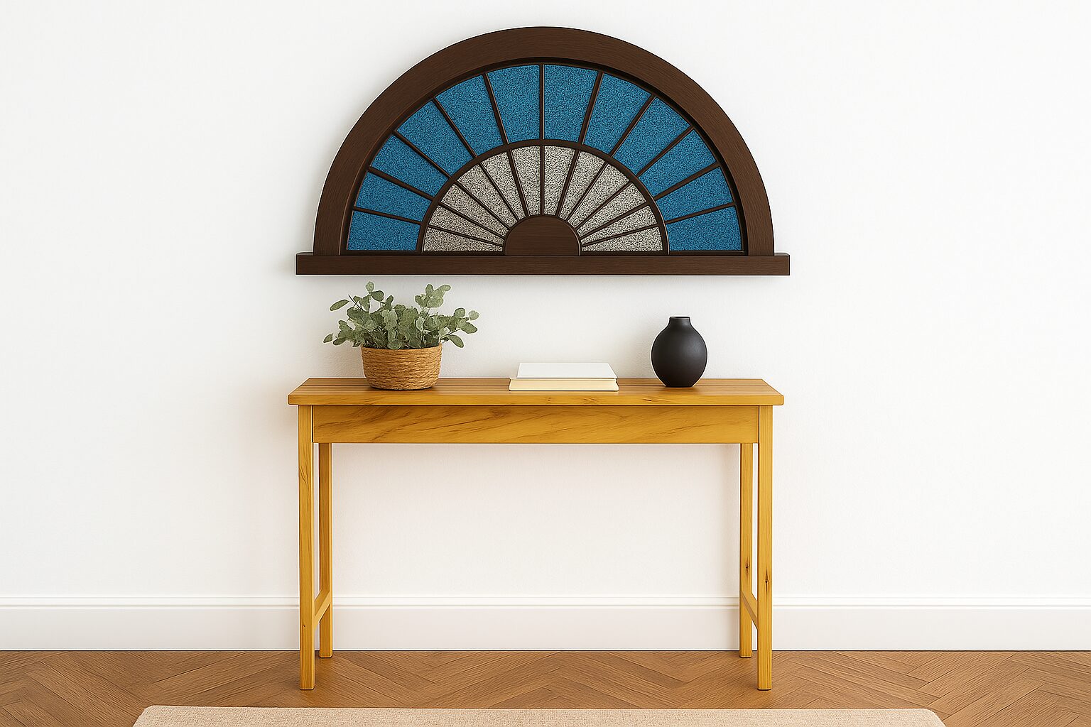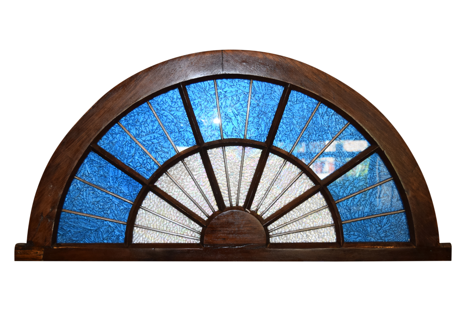 This semi circular wooden window frame was given a new personality with dichroic blue and white stained glass.