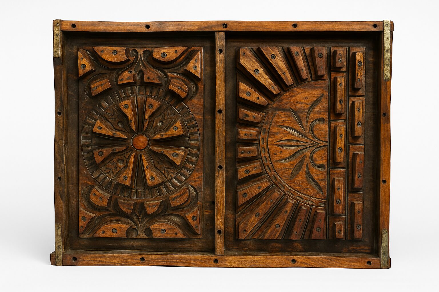 This double wooden cement tile mold is one a series of antique wooden cement tile casting molds that originated from India and Egypt. It showcases a unique design and craftsmanship.